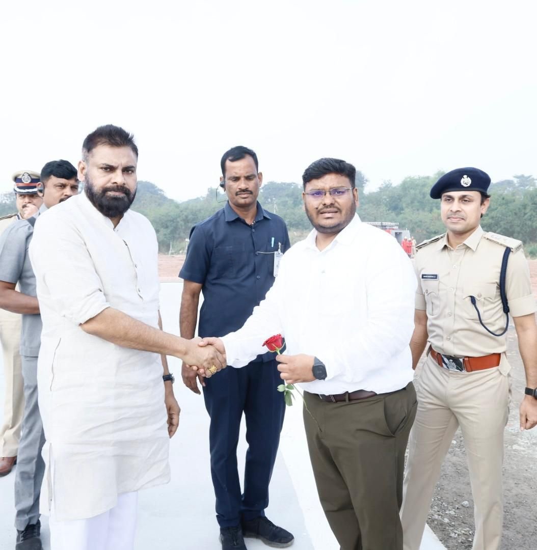 కాకినాడలో ఏర్పాటు చేయనున్న గ్రీన్ అమ్మోనియా ప్రాజెక్ట్ శంకుస్థాపన కార్యక్రమానికి విచ్చేసిన రాష్ట్ర ఉప ముఖ్యమంత్రి శ్రీ పవన్ కళ్యాణ్ గారికి హెలిప్యాడ్ వద్ద అధికారులు, ప్రజా ప్రతినిధులు, కూటమి నేతలు ఘన స్వాగతం పలికారు. ఈ సందర్భంగా ఏఎం గ్రీన్ సంస్థ ప్రతినిధులు ఉప ముఖ్యమంత్రికి పుష్పగుచ్ఛం అందించి అభివాదం చేశారు.